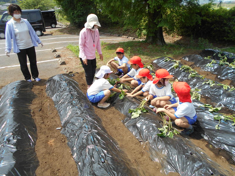 また、2年生ではイモの苗植えが行われていました。様子をのぞきに行くと、ある女の子が「校長先生、苗を横向きに植えるとね、たくさんイモができます。」と教えてくれました。恥ずかしながら・・・初めて知りました。勉強になります!。先生のことばは子どもたちにしっかりと届いているようです。