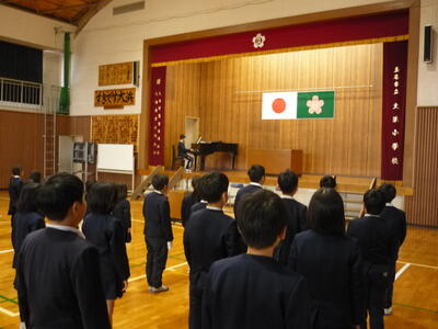 まず、5年生が見本として校歌を歌ってくれました。来年度最上級生となる5年生は、これまで今日のためにコツコツと練習してきてくれたのです。