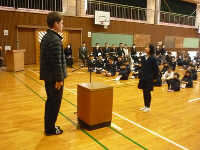最初に校長先生から、それぞれの学年を修了しましたという証となる「修了証」を、各学年の代表児童に渡していただきました。