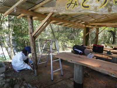 梅田先生の指導のもと、柱の下の部分に防腐剤を塗ったり、