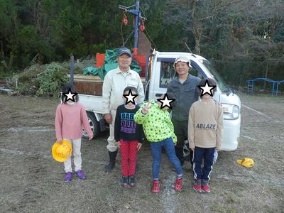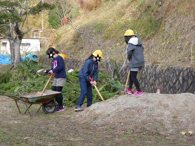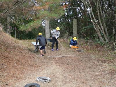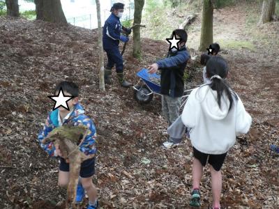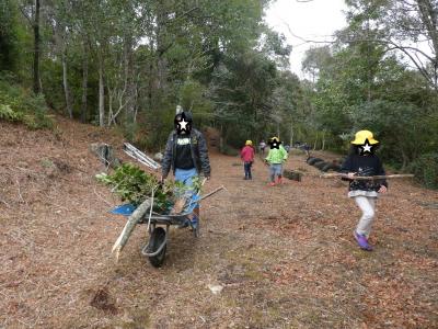 梅田先生や地域の方が木を切り、子どもたちがみんなで枝を運んで、忍者の森がきれいになりました。