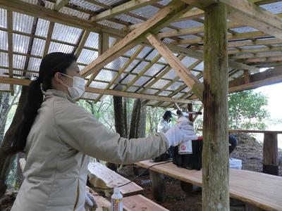 梅田先生の指導のもと、柱の下の部分に防腐剤を塗ったり、