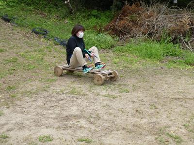 一川さんはグラウンドに丸太のシーソーを作ってくださいました。腐食剤を塗る前ですが、さっそく校長先生と5年生が遊んでいました。