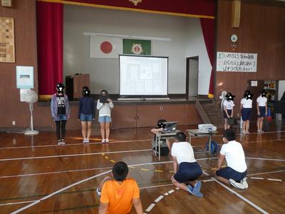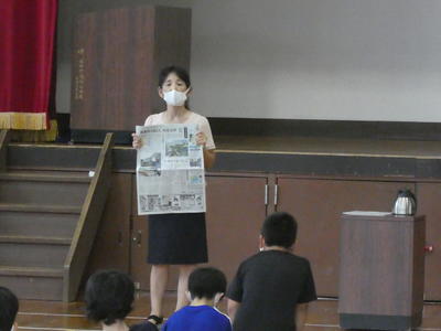 全校集会では校長先生が7月豪雨の新聞記事を使ってのお話をされました。