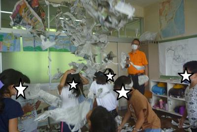 新聞を使った遊びを考え、紹介し、先生たちと一緒にたくさん遊びました。