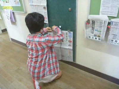 新聞にあった知らない言葉調べや、文字探し、同じコーナーを三日分貼り付けて比べたり、虫や動物がある記事を見つけたり、といろんなことに取り組んでいました。