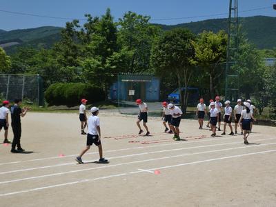 5・6年は体育で陸上の本格的な練習をしています。今日はラダーを使っての練習です。