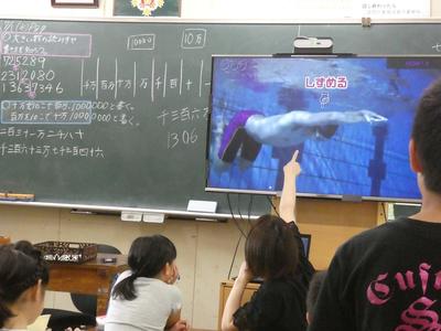 国語では、国語リーダーが中心になって、デジタル教科書を使ってみんなで漢字の書き順を確認しています。