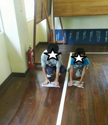 6年生が1年生に掃除の仕方を教えていました。