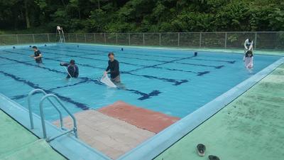 びしょ濡れになりながら、プールを一生懸命きれいにしました。