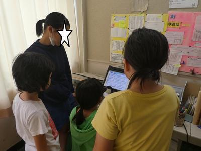 3・4年生はプールの前に水泳の足の動きを動画で確認しました。