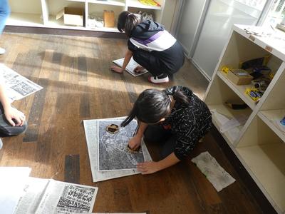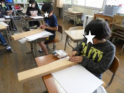 高学年は図工で版画をしています。4年生は初めての彫刻刀だったので、木の板を使って彫る練習をしました。