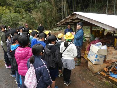 浅野先生手作りの昆虫ランドに子どもたちがカマキリの卵を入れています。
