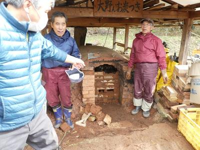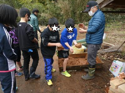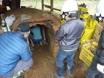 入り口をレンガでふさぎますが、その時にレンガをくっつける土をぺったんぺったん。