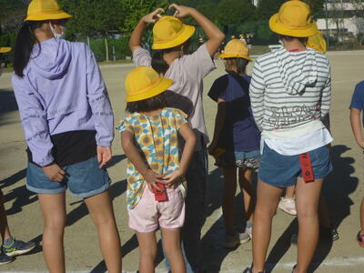 今日、朝の活動は全校体育で、しっぽ取りがありました。みんな元気よく走っていました。その後、各学年で、反復横跳びの練習もありました。