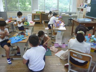 先週、4年生の図工の時間の様子です。みなさん、カッターを上手に使い色画用紙を切っていました。力作が完成していました。