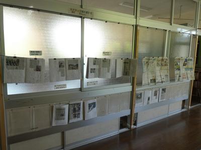 多目的室前の廊下の掲示にNIEとして、スクラップブックの隣に小学生新聞を掲示します。