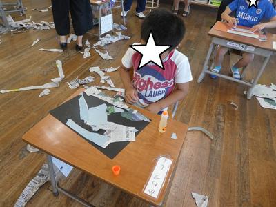 新聞の色や形を見て、いろいろ考えて貼っていきます。