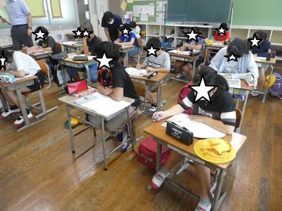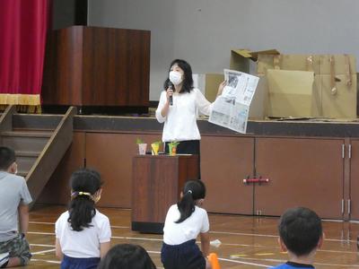 先生が新聞の記事を読み、子どもたちがそれぞれメモを取りました。