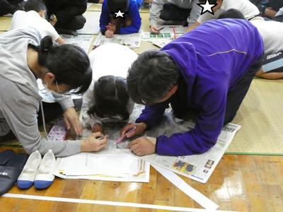1・2年生の放課後学習会で地域の方と一緒に新聞の好きなところを切り取って画用紙に貼り付けました。