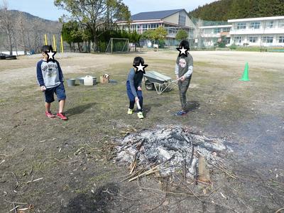 PTA会長を始め、有志の方々が大野小のグラウンドで鬼火焼きの準備をしています。