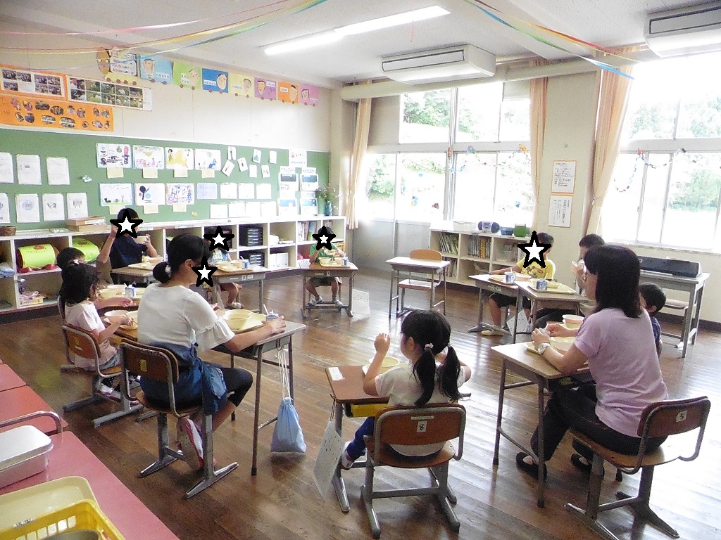 複式学級の5年生が集団宿泊なので、6年生は二日間、1年生と一緒に給食を食べました。