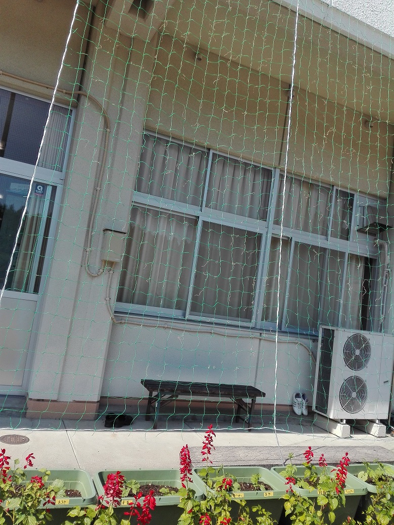 4年生のツルレイシ(ゴーヤ)の勉強で苗をプランターに植え、グリーンカーテンができるようにネットをかけました。