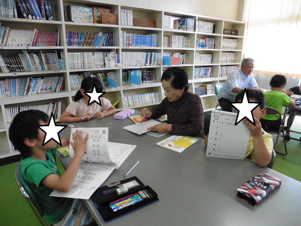 毎週月曜日の放課後に、1・2年生が学習会を行っています。地域の学校応援団の方に丸をつけてもらいます。