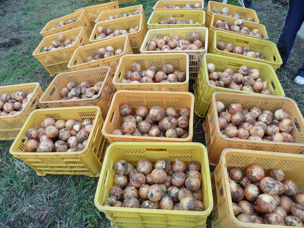 コンテナいっぱいに入った玉ねぎをみんなで協力して運びました。