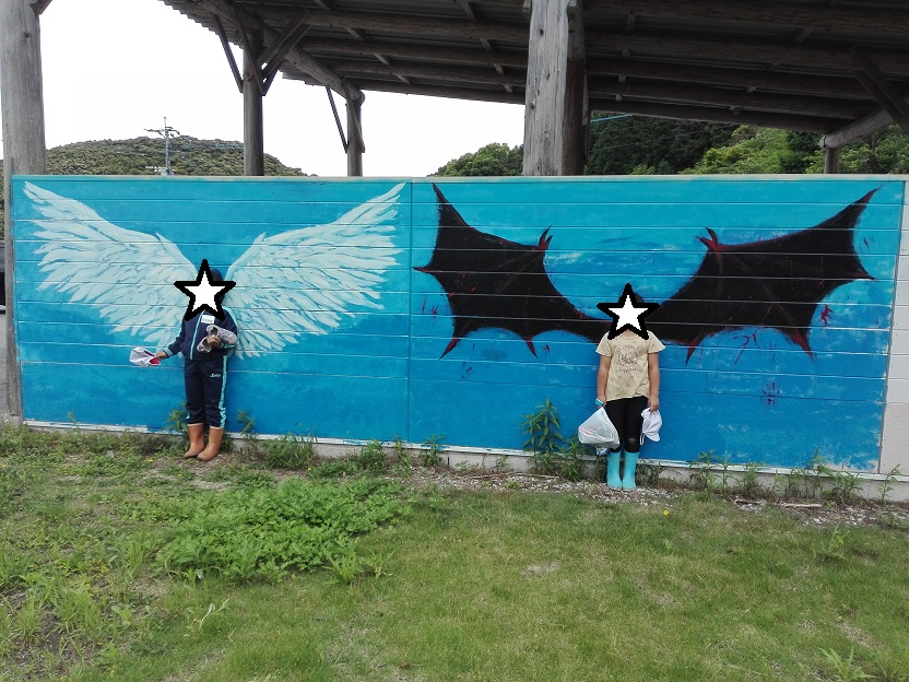 小学校の近くの壁に羽の絵がありました。