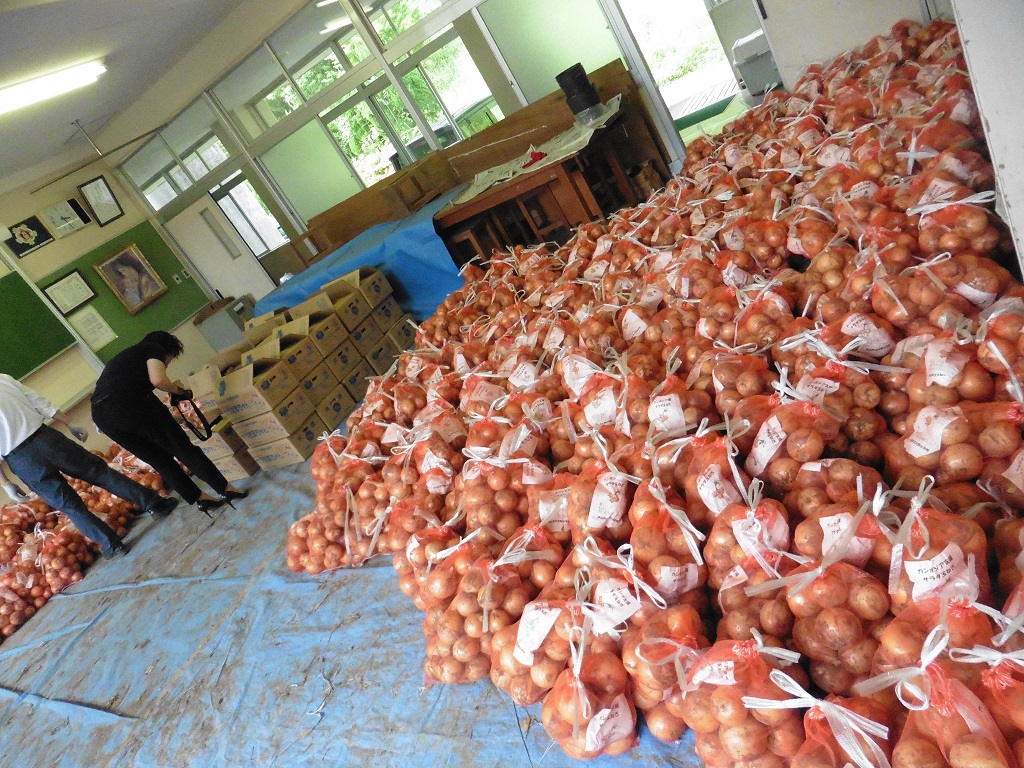 5kgの玉ねぎとメッセージを袋に入れる作業です。
