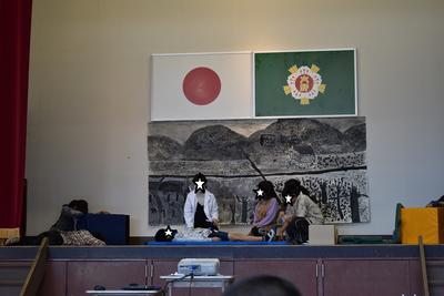 6年生は戦争について学んだことです。戦争の悲惨さを伝える劇をし、「風を切って」を演奏し、自分たちの思いを発表しました。