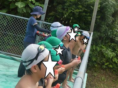 プールの時、みんなでスイカを食べて種飛ばしをしました。