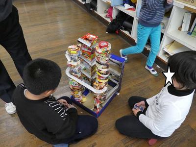 2年生が図工で立体迷路を作っています。コロコロタウンとコロコロランドです。