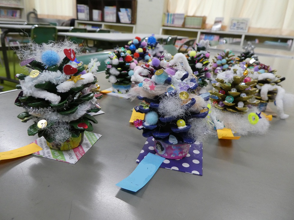 1・2年生の放課後学習会で、放課後学習会の先生方と一緒に松ぼっくりツリーを作りました。