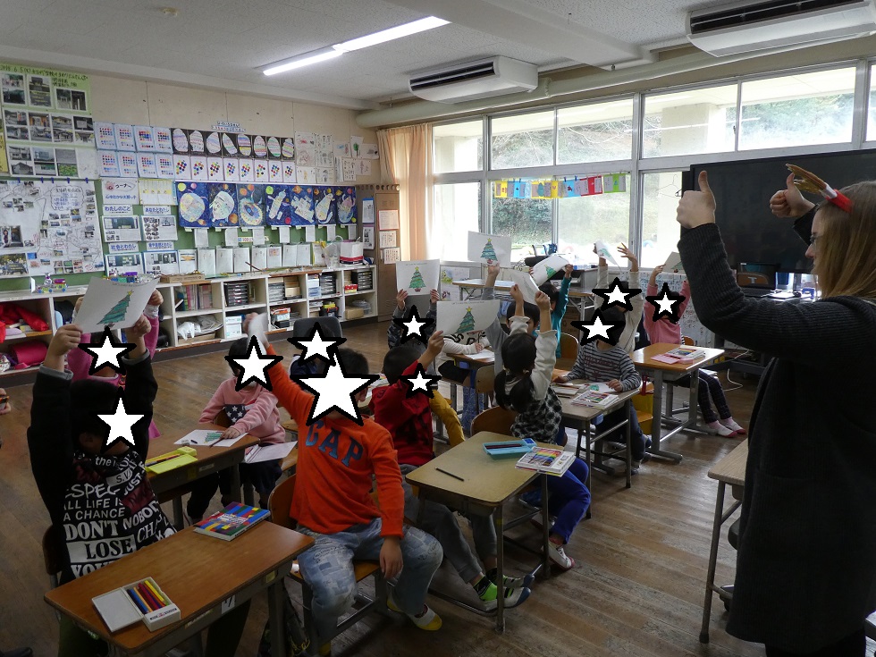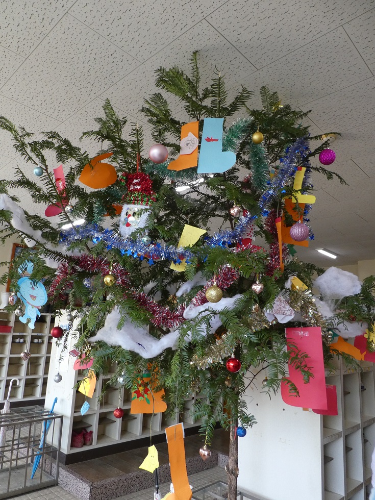 児童玄関のクリスマスツリーに飾りがたくさんつきました。