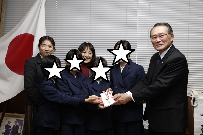 カンボジア支援募金贈呈式がありました。大野小の子の4人が代表で行ってきました。