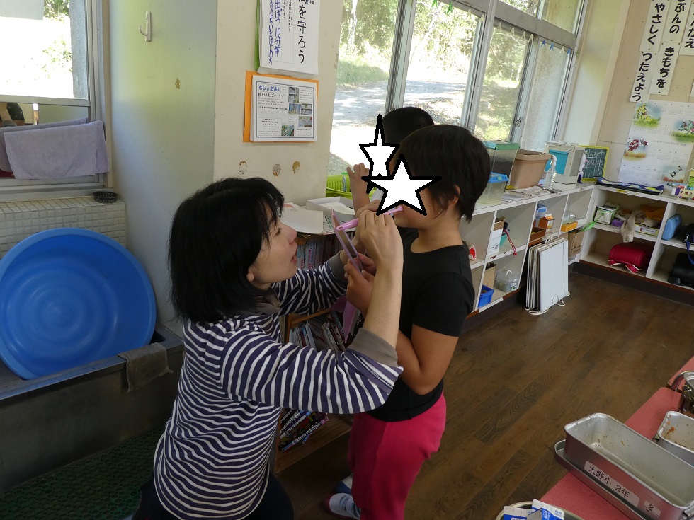 保健の先生が給食後の歯磨きをチェックしています。上手に磨けているかな?