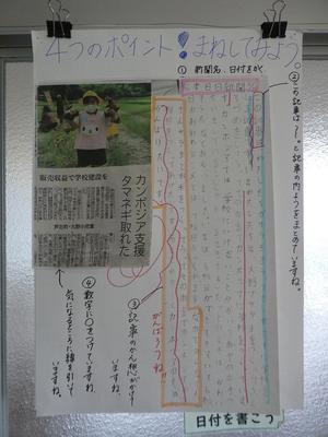 多目的室前の廊下の掲示にNIEとして、スクラップブックの隣に小学生新聞を掲示します。