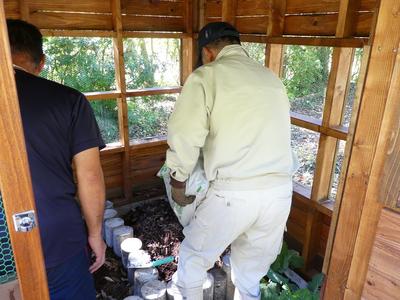 一原さんが腐葉土と一緒にカブトムシの幼虫をたくさん持ってきてくださいました。