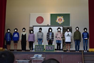 6年生は戦争について学んだことです。戦争の悲惨さを伝える劇をし、「風を切って」を演奏し、自分たちの思いを発表しました。