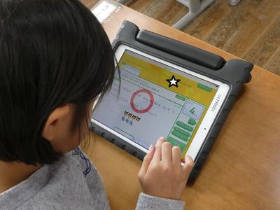 授業内容の習熟の時間として、タブレットでeライブラリのドリル学習をしています。