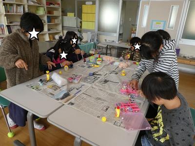 笑顔わくわくプロジェクトで、ボランティアの方々と一緒に松ぼっくりツリーを作りました。