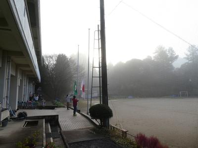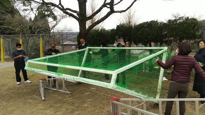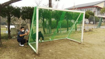 職員作業で、片方のサッカーゴールにネットをかけました。