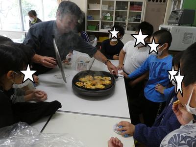 1~3年生が、育てたトウモロコシを使って、小さいピザを作りました。