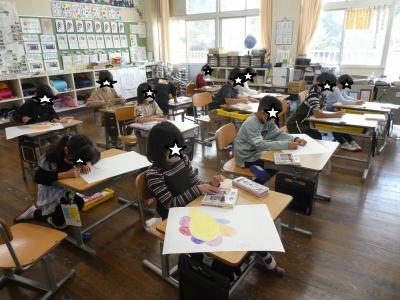 新入生のために、1・2年生が教室に飾る絵を描いています。