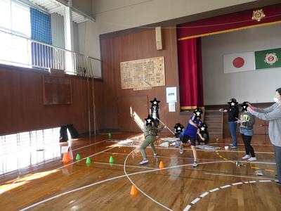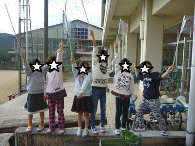 みんなでせっせと作っていた新聞の棒ですが、応援の旗になりました。