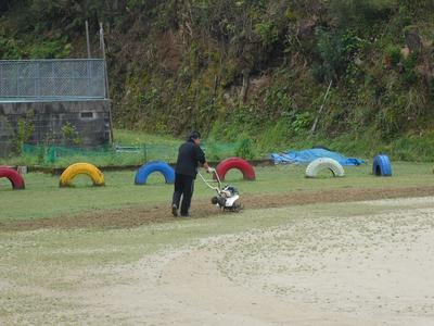 新学期に子どもたちが思い切って遊べるように先生方が運動場の整備をしています。