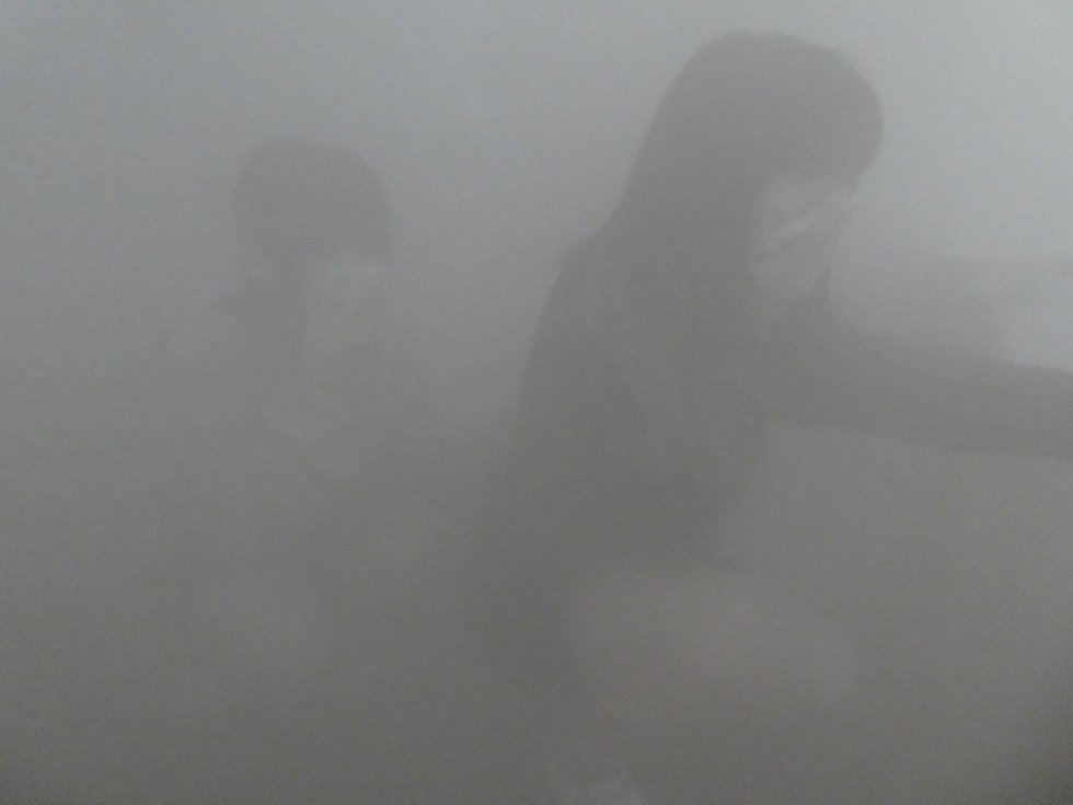 煙体験です。煙(無害な煙を使用しています)の中をどう進むのか教えてもらいました。