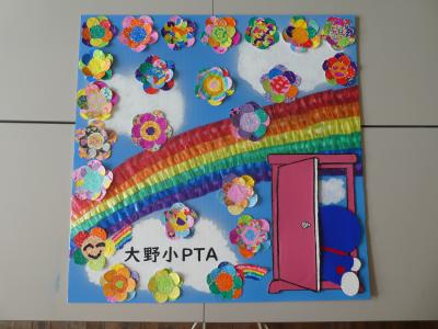 子どもたちと保護者で作ったちぎり絵の花の壁掛けを佐敷小にプレゼントしたいと思います。